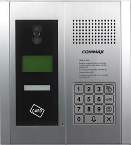 - Video kaputelefon kültéri egység. - Commax video beltéri egységekkel kompatibilis. - 99 lakáshoz, akár 500 lakásig is bővíthető. - Alumínium előlap. - 2,7 LCD kijelző. - Közvetlen videohívás. - PIN kóddal történő bejutás. - RFID kártyaolvasó. - Frekvencia_ 13,56 MHz. - Vezetékezés: UTP (CAT. 5e). - Süllyesztett kivitel. - Vandálbiztos kialakítás. - Tápellátás: 14VDC. - Áramfelvétel: 2,5 A max. - Méretek: 250 x 276 x 12 mm. - CE minősítés.