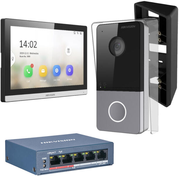 1 lakásos kaputelefon szett, vékony kávás fekete beltéri egységgel, wifi-s kültéri egységgel, esővédővel, fordítóval, PoE swichel A Hikvision DS-KIS607-P szett ideális választás otthonra. A szett tartalmazza a használathoz szükséges elemeket:
